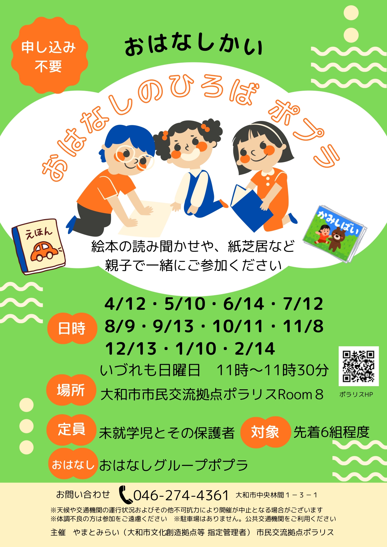 絵本の読み聞かせ、紙芝居、パネルシアターなど親子で一緒にご参加ください日時4/12・5/10・6/14・7/12・8/9・9/13・10/11・11/8・12/13・1/10・2/14講師おはなしグループポプラ対象未就学児と保護者 先着6組程度参加費無料問い合わせ大和市市民交流拠点ポラリス℡046-274-4361…