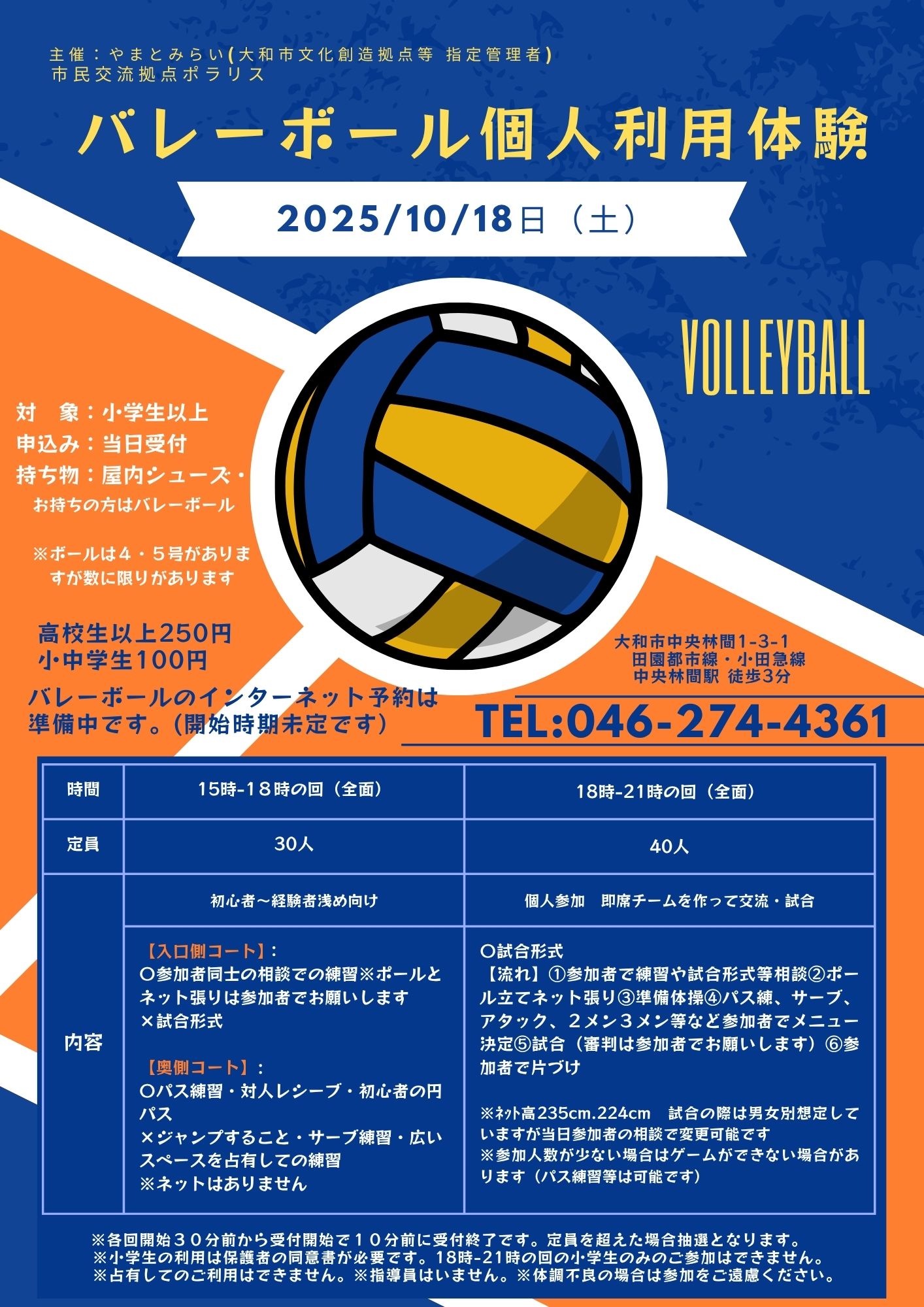 内容 | 【入口側コート】 〇参加者同士の相談で の練習(ポールとネット張りは参加者でお願いします ×試合形式 【奥側コート】 〇パス練習・対人レシーブ・初心者の円パス ×ジャンプすること ×サーブ練習 ×広いスペースを占有しての練習 ※ネットはありません | 〇試合形式 【流れ】①参加者で練習や試合形式等相談 ②ポール立てネット張り③準備体操④パス練 ⑤サーブ、アタック、2メン3メン等 ⑥試合(審判は参加者でお願いします) ⑦参加者で片づけ ※ネット高235cm.224cm 試合の際は男女別想定していますが当日参加者の相談で変更可能です |