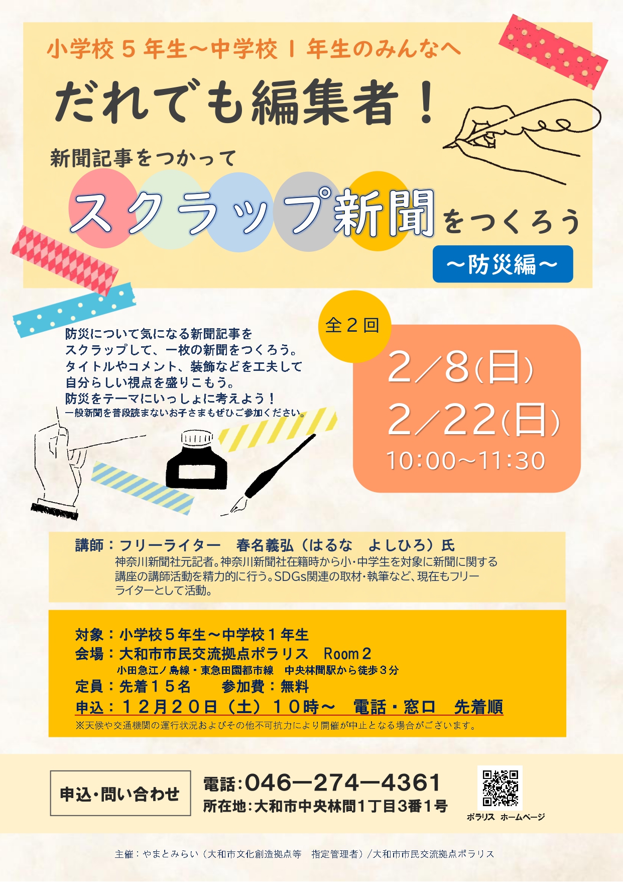 | 内 容 | 防災について気になる新聞記事をスクラップして、一枚の新聞をつくろう。 タイトルやコメント、装飾などを工夫して自分らしい視点を盛りこもう。 防災をテーマにいっしょに考えよう! 一般新聞を普段読まないお子さまもぜひご参加ください。 |
