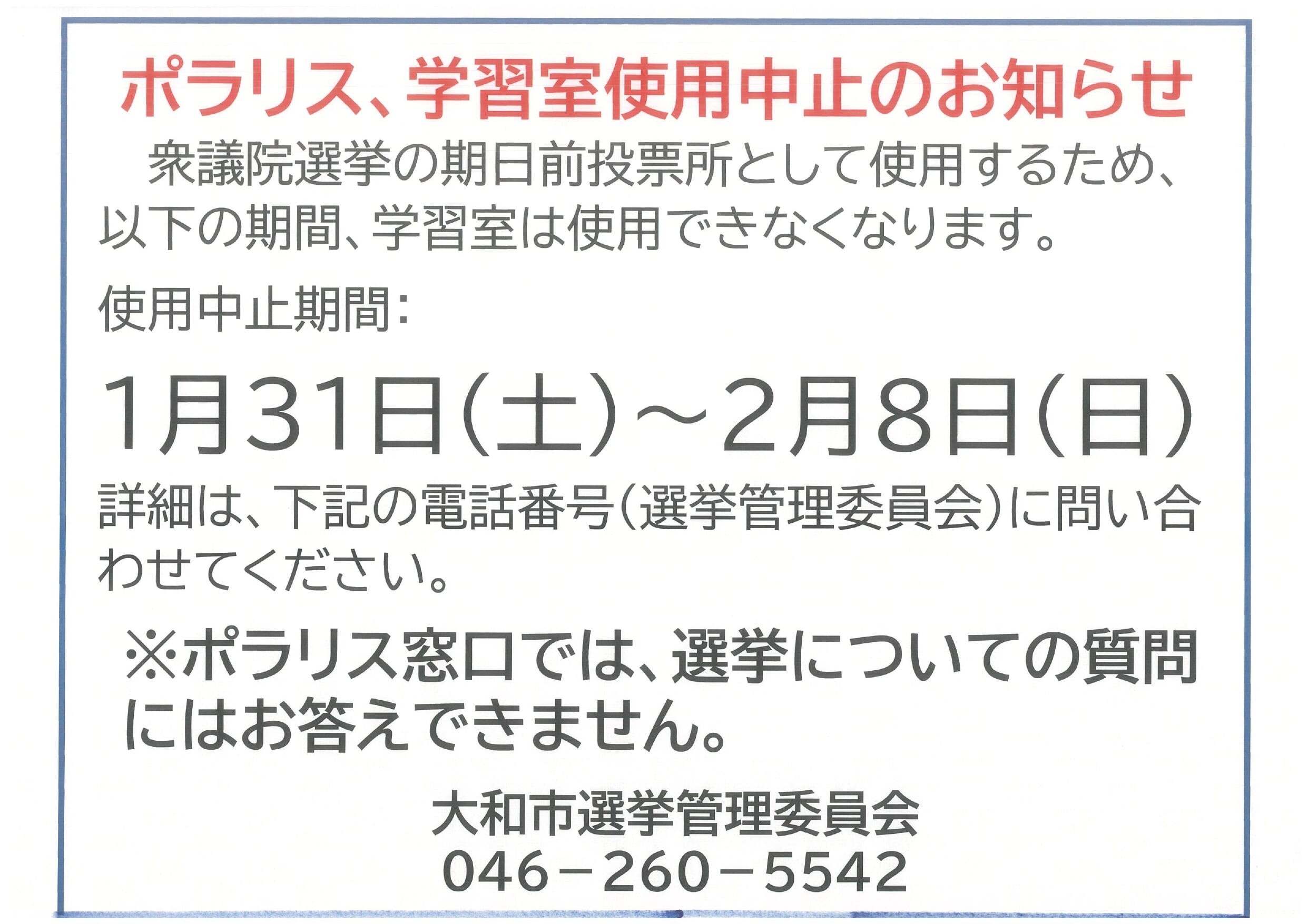 詳細は選挙管理委員会(電話046-260-5542)にお問い合わせください。※ポラリス窓口では選挙についての質問にはお答えできません