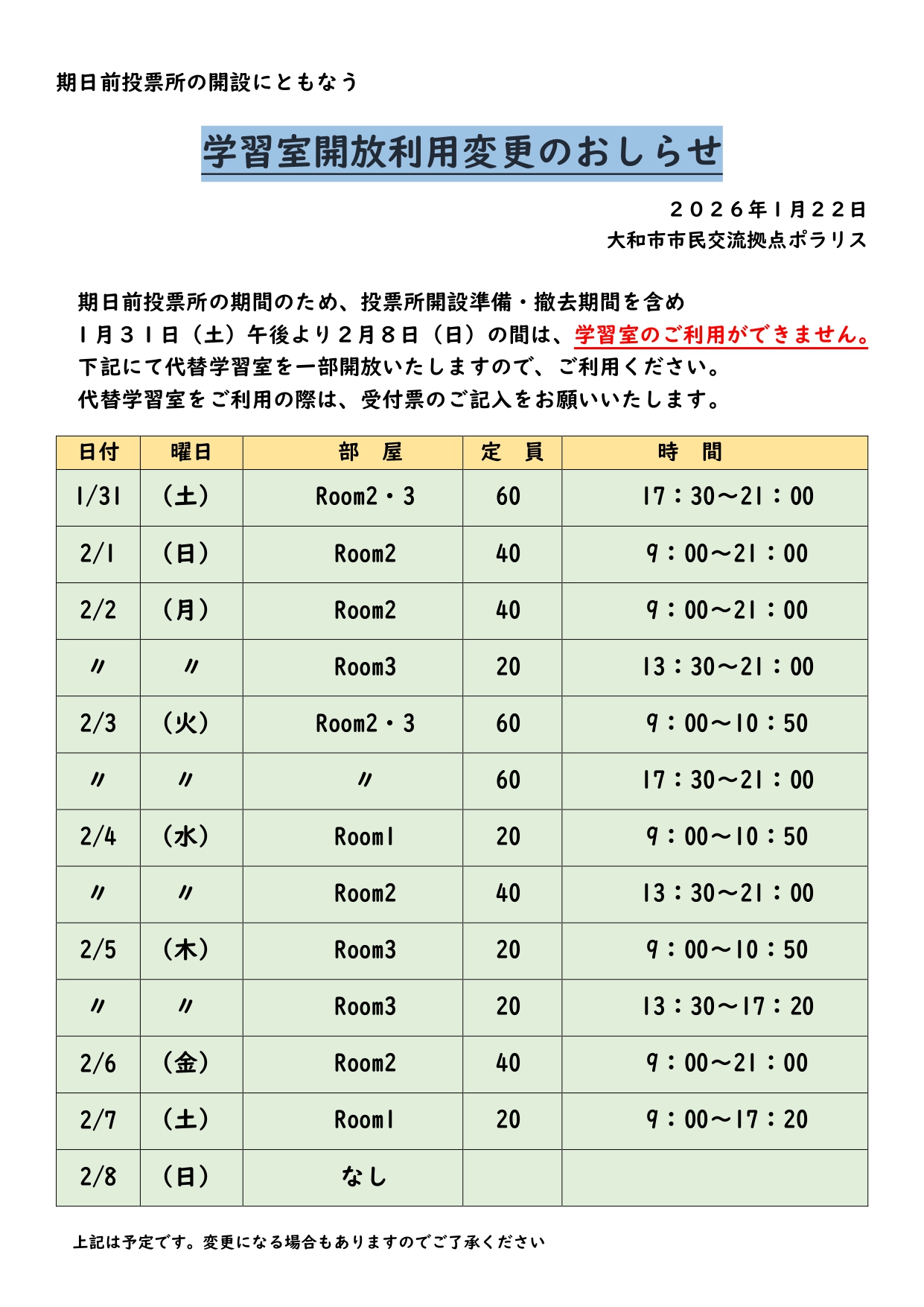 ※上記期間に代替学習室として一部貸室を開放いたしますのでご利用ください