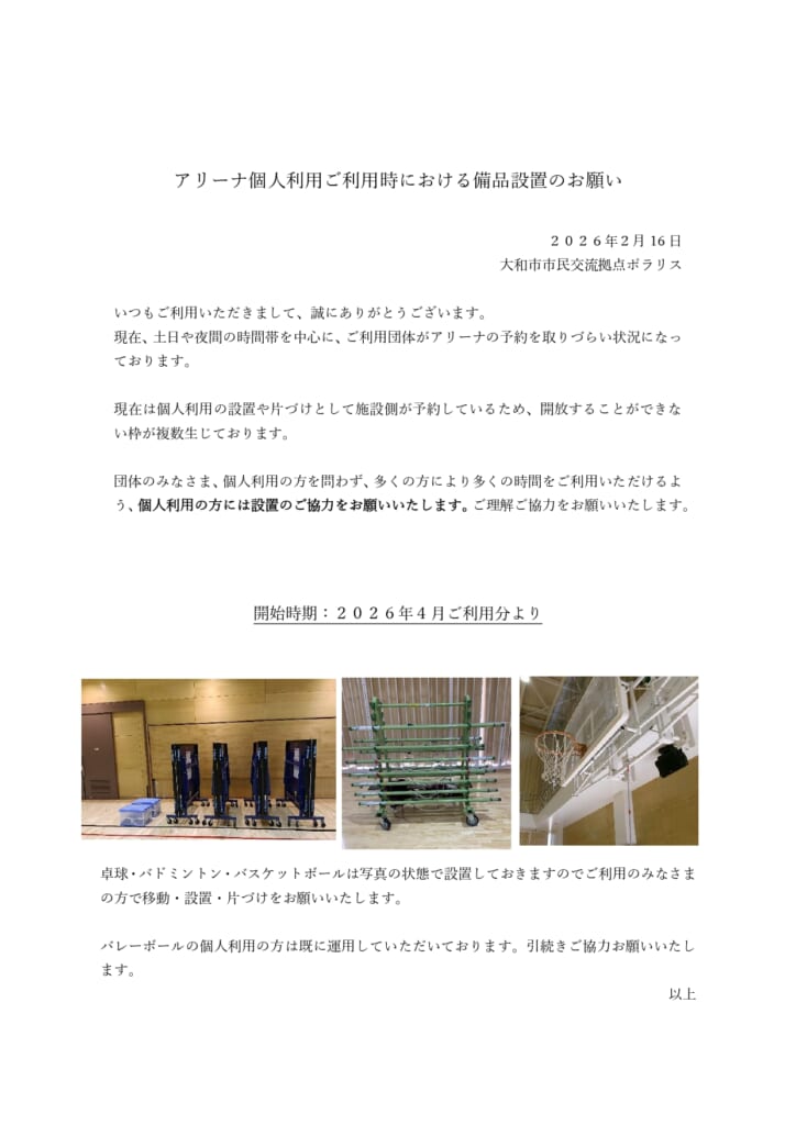 アリーナ個人利用ご利用時における備品設置のお願い