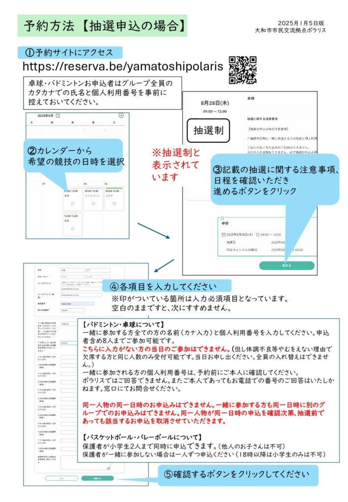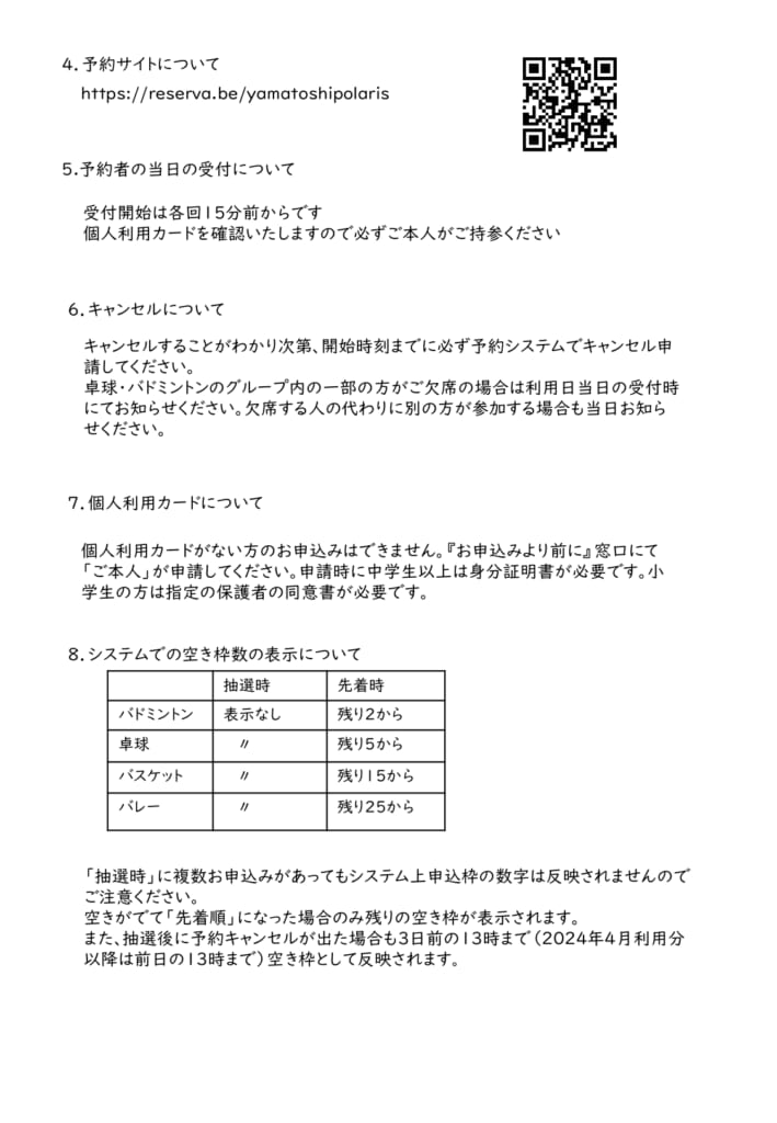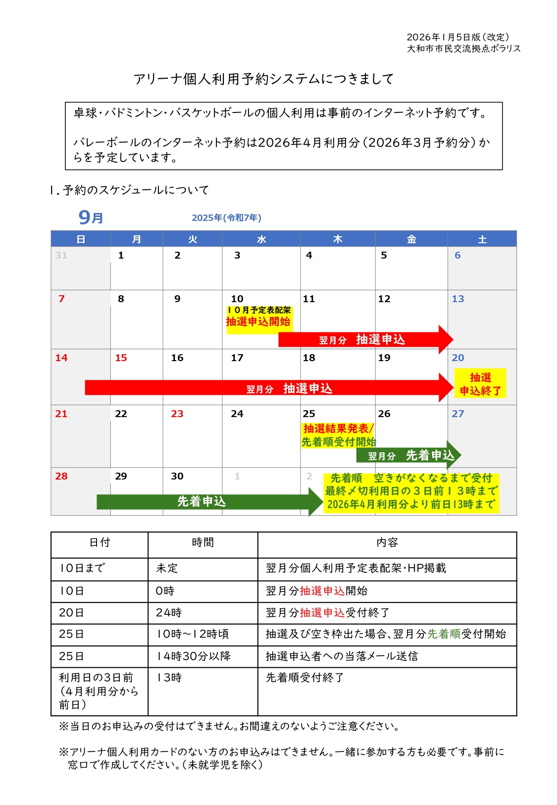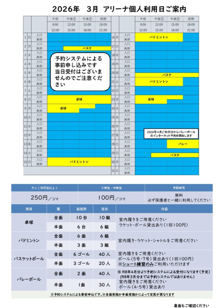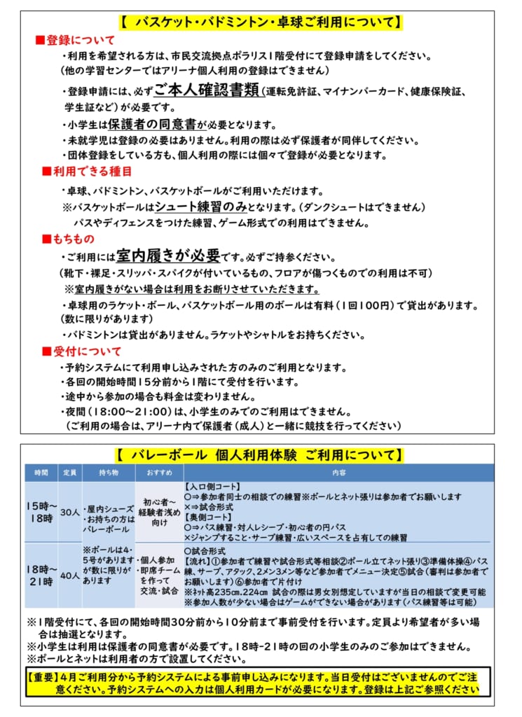 ※重要:アリーナ個人利用申し込み方法が、予約システムによる事前申し込みになりました。当日受付はございませんのでご注意ください。
