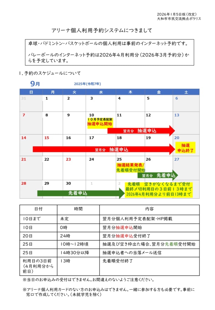 ※重要:アリーナ個人利用申し込み方法が、予約システムによる事前申し込みになりました。当日受付はございませんのでご注意ください。